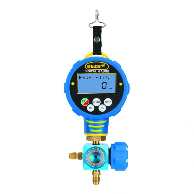 Цифровая манометрическая станция DSZH WK-6881L представляет собой одновентильный цифровой манометрический коллектор с  комплектом из двух зарядных шлангов и смотровым стеклом, поставляется в металлическом кейсе. Цифровой мановакуумметр WK-688L/Н, они бывают синие (WK-688L, для низкого давления) и красные (WK-688H, для высокого), отличие: синий может  и вакуум измерять и температуры кипения. В памяти у него температуры кипения по 82 хладагентам, можно изменять единицы измерения температуры (°C, °F) и давления (кПа, Бар, Psi, торр, кгс/см2, дюйм рт.ст., мм рт.ст.), можно переключать в режим вакуумметра (нажатием и удержанием клавиши "ZERO", в режиме вакуумметра не отображается хладагент и температура - только давление и показывает % от "полного" вакуума).