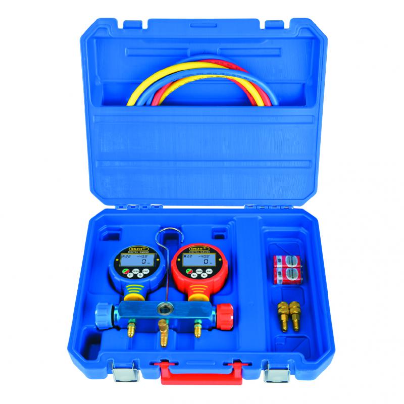 Цифровая манометрическая станция DSZH WK-6882L представляет собой двухвентельный цифровой манометрический коллектор с  комплектом из трех зарядных шлангов и смотровым стеклом, поставляется в пластиковом кейсе. Цифровой мановакуумметр WK-6882. В памяти у него температуры кипения по 82 хладагентам, можно изменять единицы измерения температуры (°C, °F) и давления (кПа, Бар, Psi, торр, кгс/см2, дюйм рт.ст., мм рт.ст.), можно переключать в режим вакуумметра (нажатием и удержанием клавиши "ZERO", в режиме вакуумметра не отображается хладагент и температура - только давление и показывает % от "полного" вакуума).